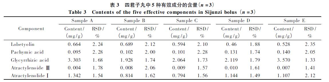 分別取5 個(gè)廠家生產(chǎn)的四君子丸,按1. 3 節(jié)的方法操作,取供試品溶液10 μL 進(jìn)樣分析,并計(jì)算丸劑中5 種成分的含量,結(jié)果見表3。